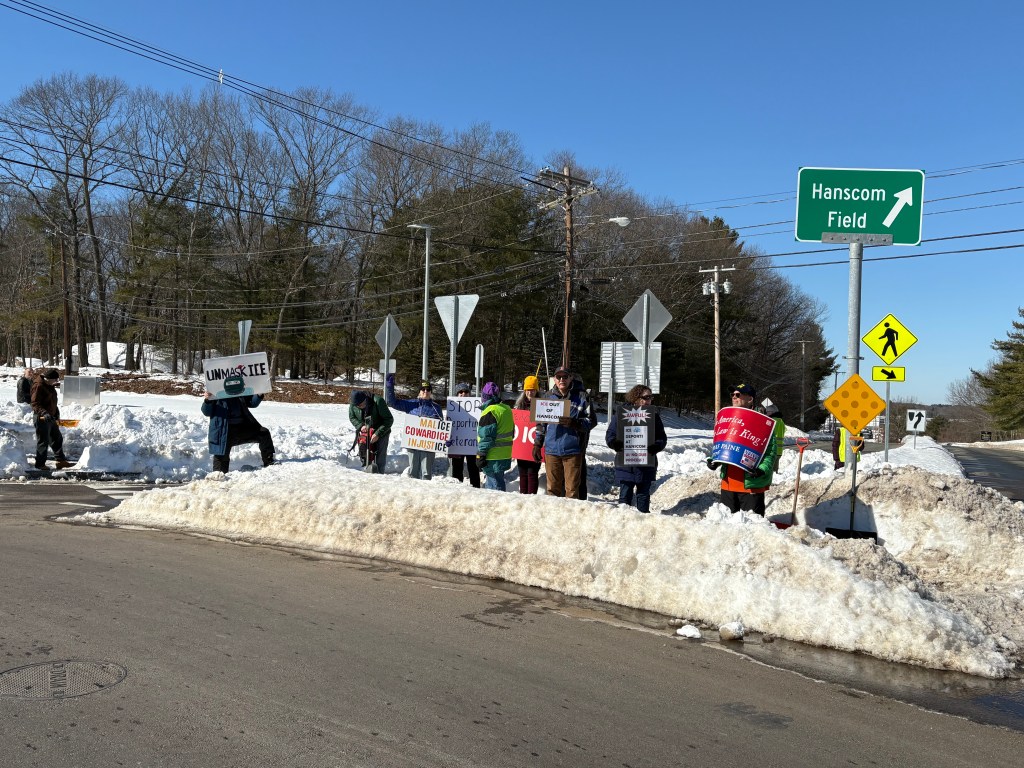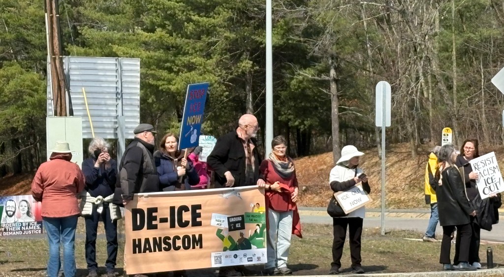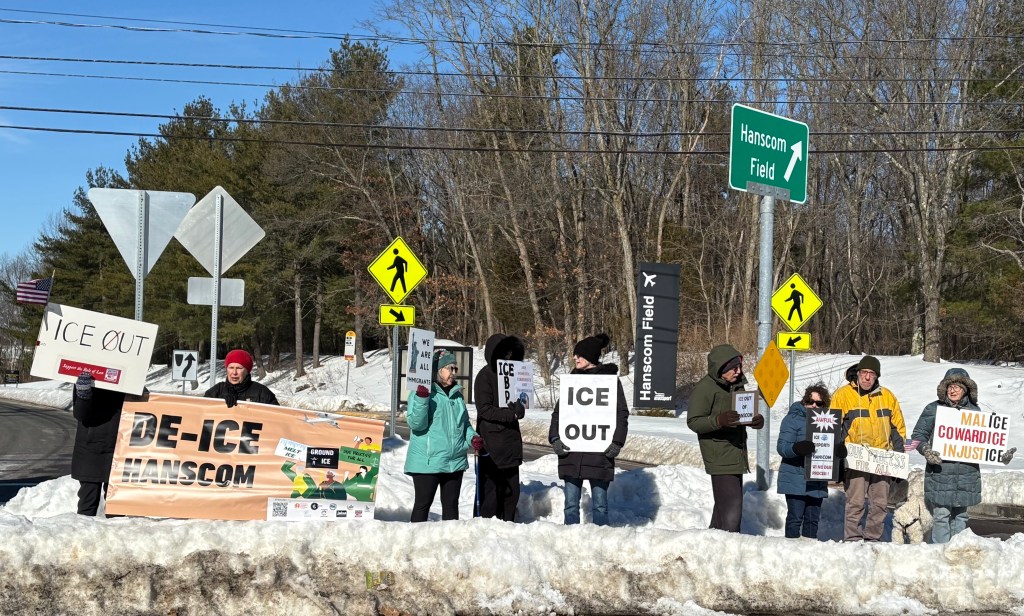 We have been standing out at this entrance to Hanscom Airfileld since October 2025. We are shining a light on the activities of ICE and this airport as part of Trump’s deportation devastation.