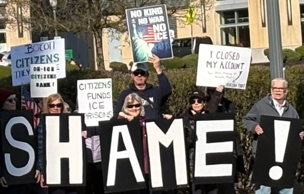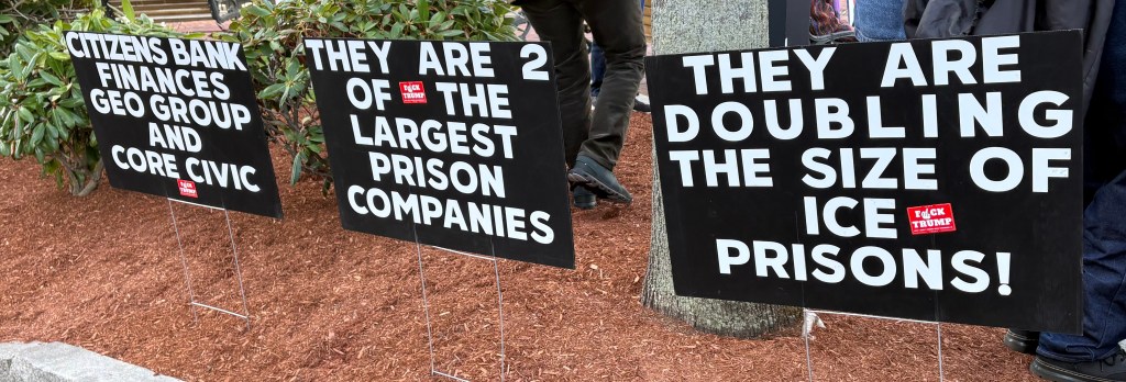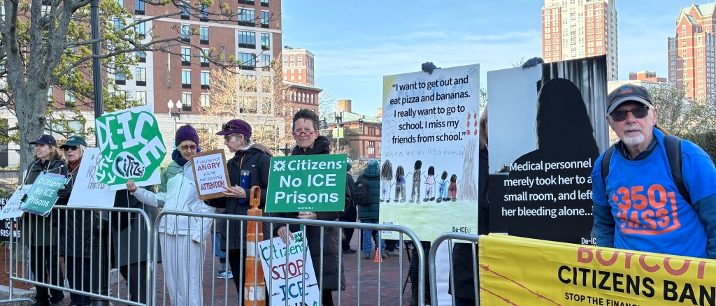 50 protesters left from Concord, MA at 6:15 AM to join the rally of the annual shareholder’s meeting of Citizen’s Bank in Providence, RI. We were there to ell the shareholders of Citizen’s bank to compel Citizen’s to stop bankrolling ICE’s mass deportation warehouses. Several activist-shareholders spoke about Citizen’s roll in enabling the expansion of these facilities that many liken to concentration camps. The crowd of 300 booed, chanted and yelled “Shame” as shareholders arrived for the annual meeting. Speakers from AFT Teacher’s Union, GBIO, the Greater Boston Interfaith Organization and the Brown University union are demanding a meeting with executives within 1 week. Otherwise they will divest several millions dollars from Citizen’s